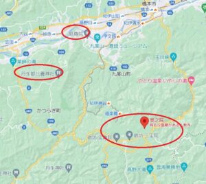 地図:前述の慈尊院、丹生都比売神社と高野山の位置。