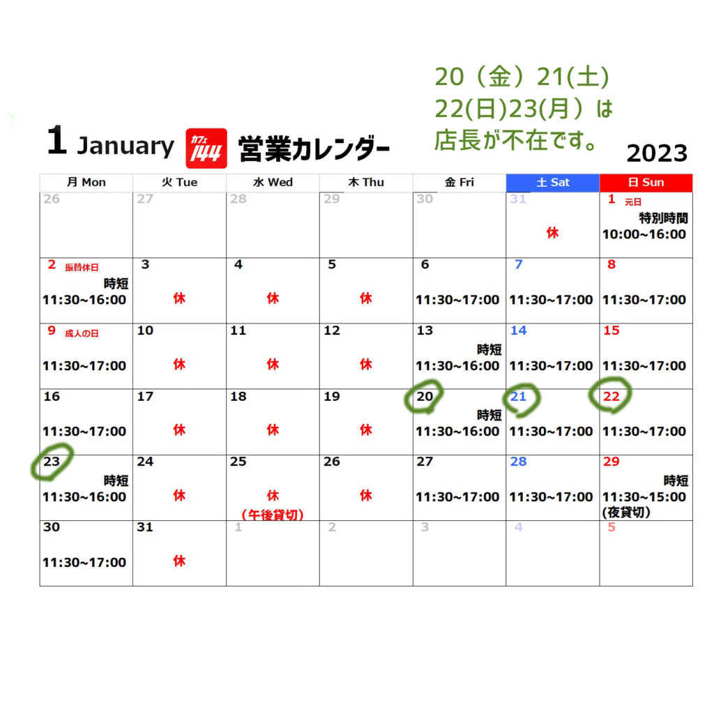 20~23日は店長不在です。